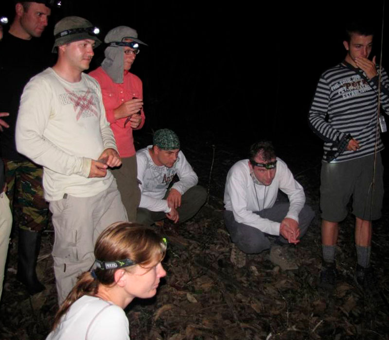Expedición nocturna buscando (y escuchando) animales nocturnos, incluyendo caimanes, ranas, serpientes entre otros.